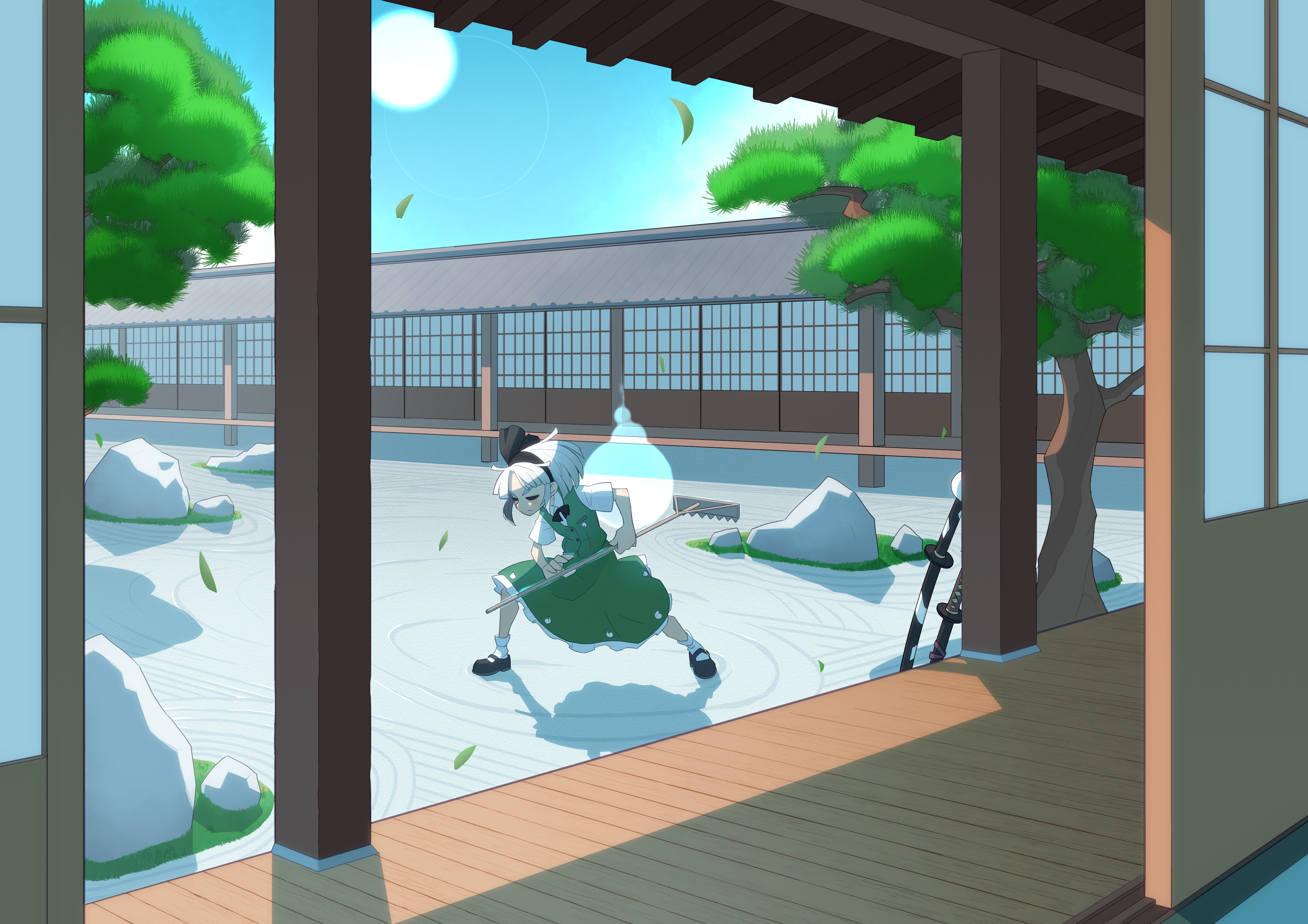Youmu Konpaku brandishes her rake and swathes a path through Hakugyokurou's rock garden, deftly tracing complex lines in the sand. In only a few moments Youmu is back on the deck and does a sheathing motion with her tool before admiring her handiwork: the lines form meticulously crafted waves around the carefully maintained trees and stones.