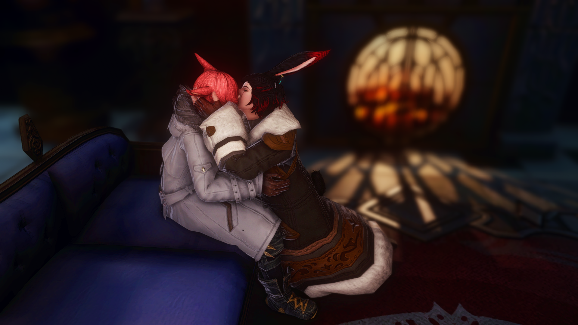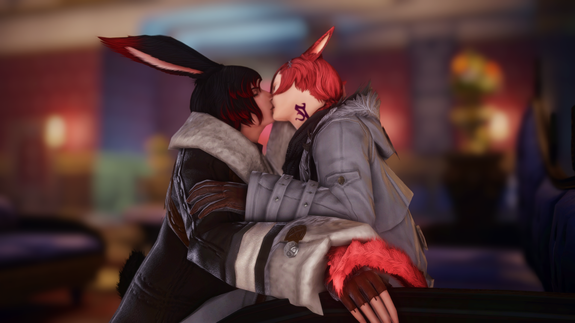 A surge of emotion in his chest pulled him up onto his knees, like a puppet being pulled on a string. He’d expected the Miqo’te to shift back in response, or at the very least to seem startled. But G’raha remained still in his seat, watching in rapt expectation and forcing R’alma to brace his free hand on the arm of the sofa to prevent their noses from bashing together.