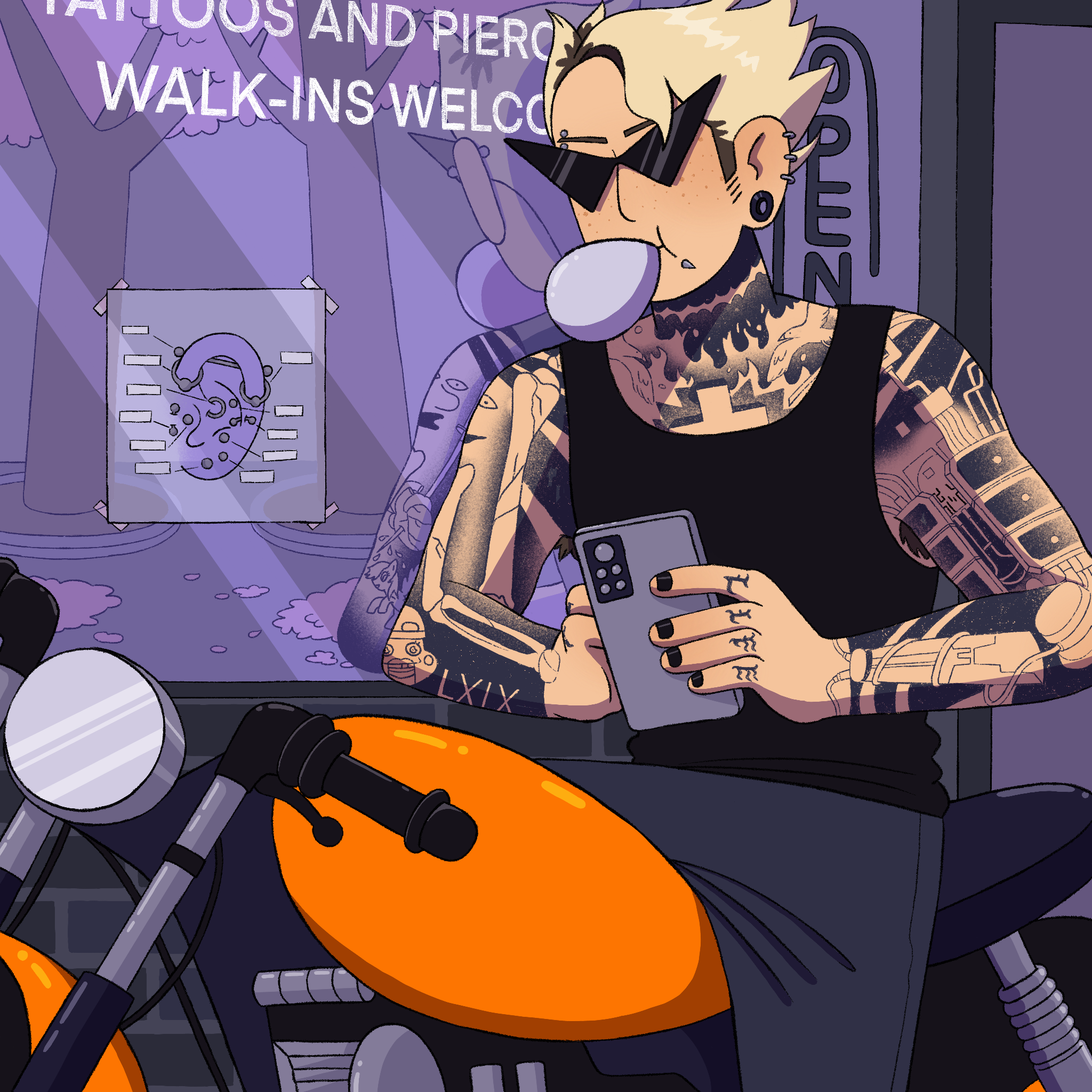 The blond emerged into the street after some time, shirt damp with sweat after working hard. Their gazes met in passing, forcing Jake to look away. Still, out of the corner of his eye he saw how he plopped down on a motorcycle (his?), pulled out his phone and unwrapped a piece of gum to go with his mindless scrolling break. Huh, so he wasn’t the smoking type.