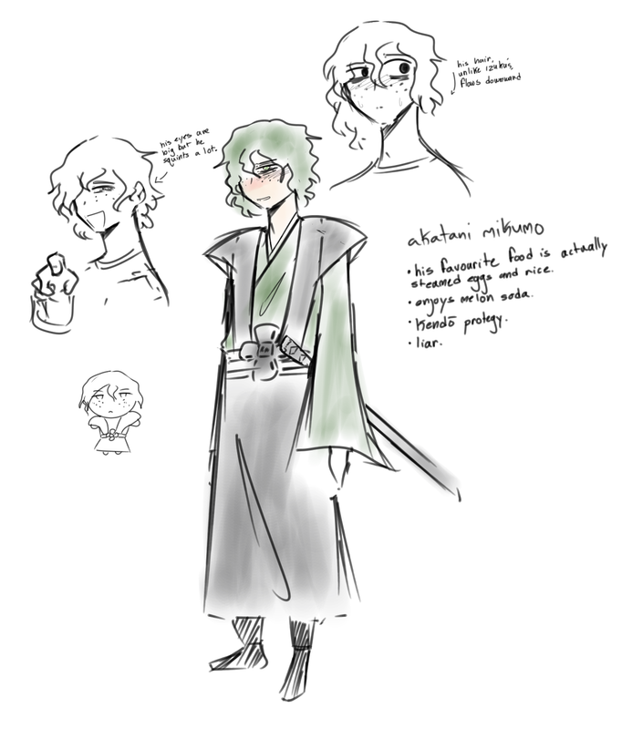 “Mom,” Mikumo says, at dinner. “I want to learn how to use a sword.” The question makes him stifle a laugh – he knows how to use a shinai.