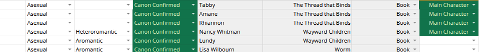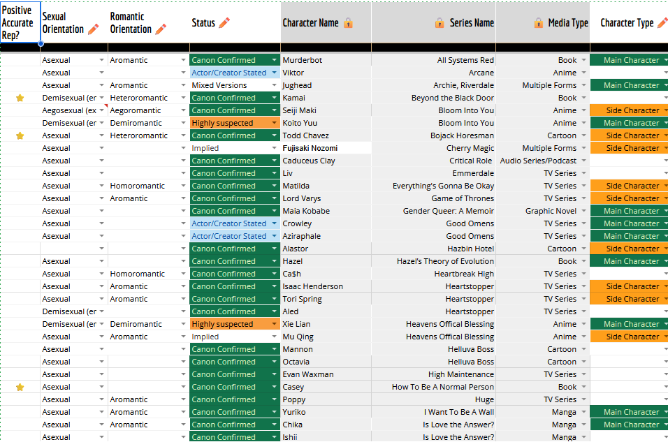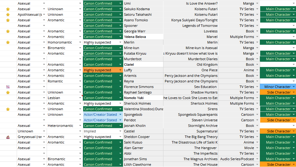 The chart below was extracted from a wonderful database/spreadsheet that is being put together to show ACE characters in media and whether they were confirmed or not. I copied the database and removed the ones that the creator listed as Headcanon for this handout.