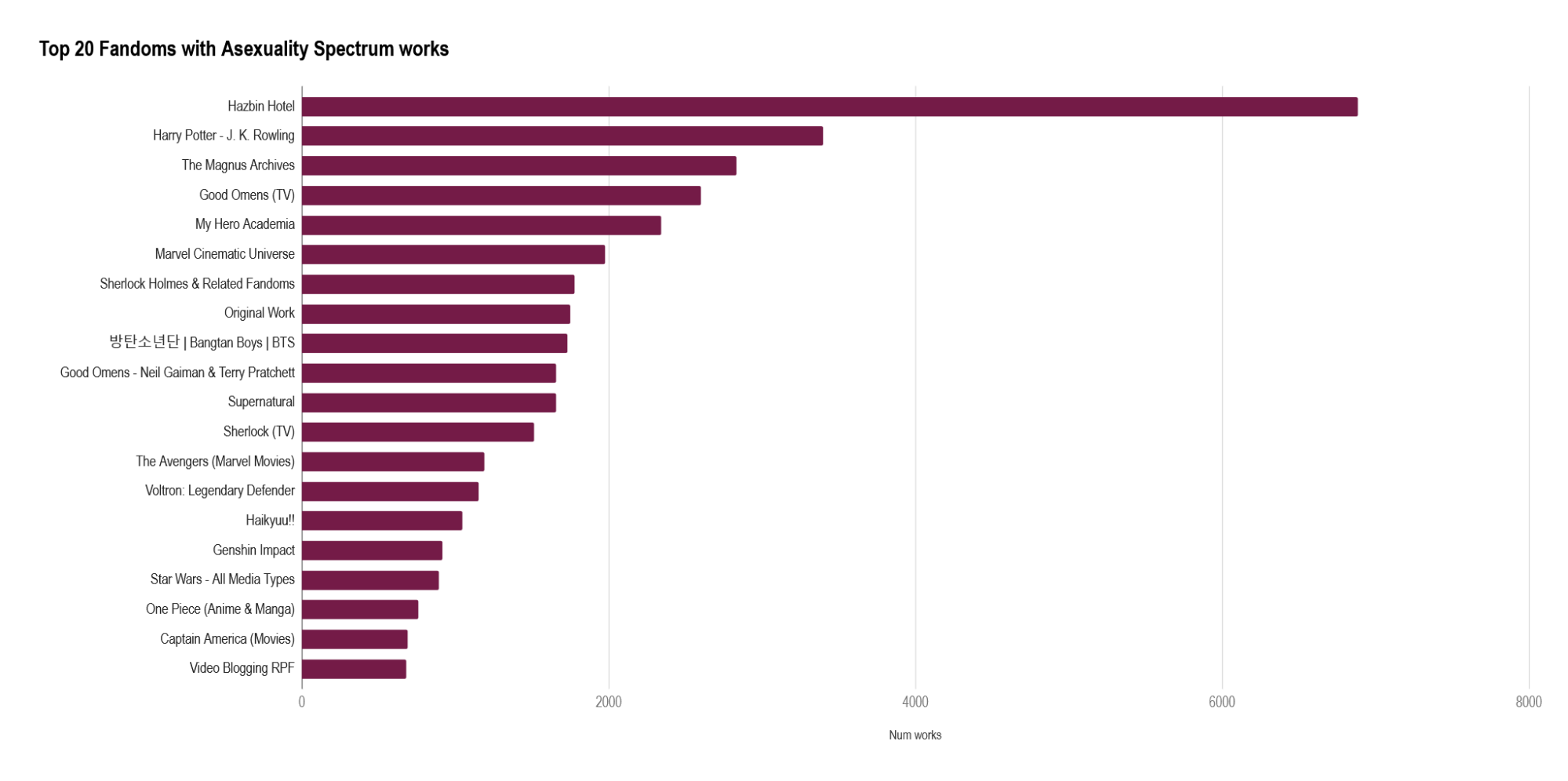 Top 20 Fandoms on the ACE Spectrum by Tagged Works in 2024