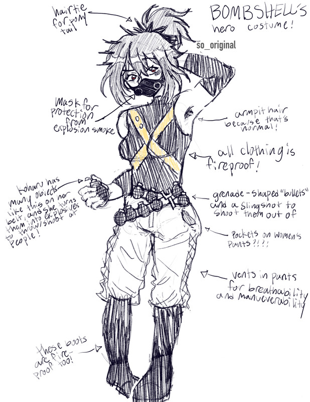 A: As of right now in the story, it's her quirk or her fists. She does have a slingshot in her hero costume that she might use sometime soon, but I also have plans to have her up her weapon game after the internships. Without any spoilers, I'll tell you that the person she interns with helps her develop a new fighting style and she decides to improve her hero costume gear a bit to match.