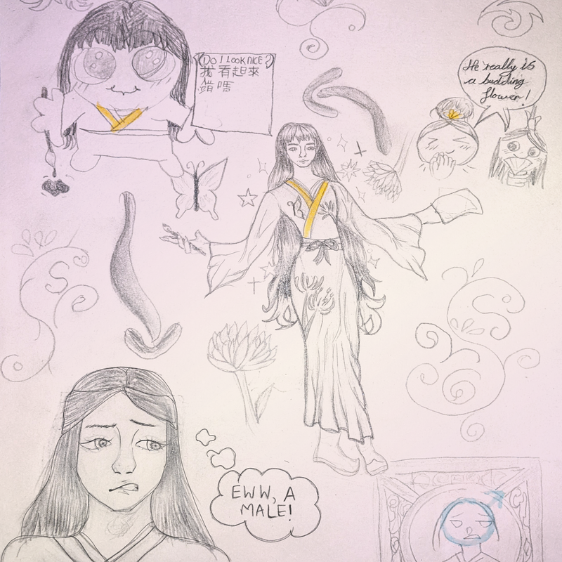 So there he was, in his inner robes that were pink and engraved, whilst still being modest. The robes would flow the same way his dance clothes would instead of a more common material -elegant and beautiful, but would cause a focus on his figure. Hua Lei sighed as he pulled his veil out of his Qiankun bag.