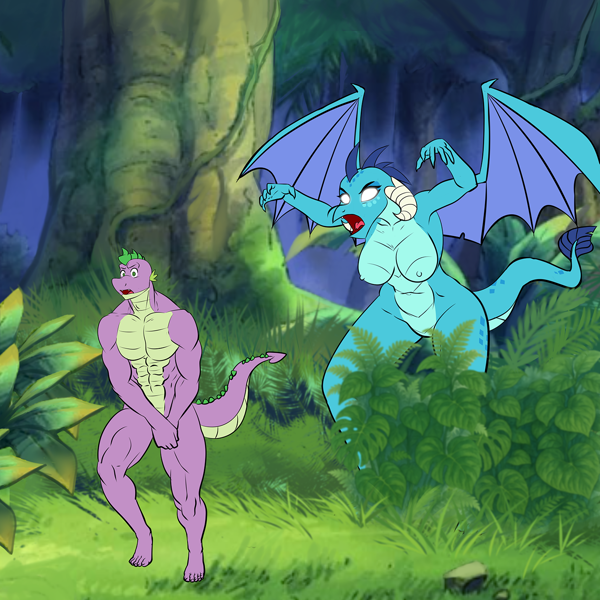Spike entonces hizo una carrera loca hacia él mientras algo lo perseguía. Estaba trepando rocas y saltando sobre ríos de lava mientras lo que sea que lo perseguía se acercaba. No pasó mucho tiempo antes de que Spike fuera derribado y estuviera cayendo por una colina con quien lo derribó. Cuando llegaron al final de la colina, quedó inmovilizado y miró hacia arriba para ver a un dragón hembra con escamas naranjas, escamas moradas en la parte superior de la cabeza y la punta de la cola, con cuernos curvados hacia arriba y ojos azules como diamantes. Spike vio que sus caderas eran la mitad de anchas que las de Ember y sus pechos eran del tamaño de Double D. Este dragón lo miró con tanta lujuria en sus ojos mientras se lamía los labios y Spike tragó saliva con miedo.