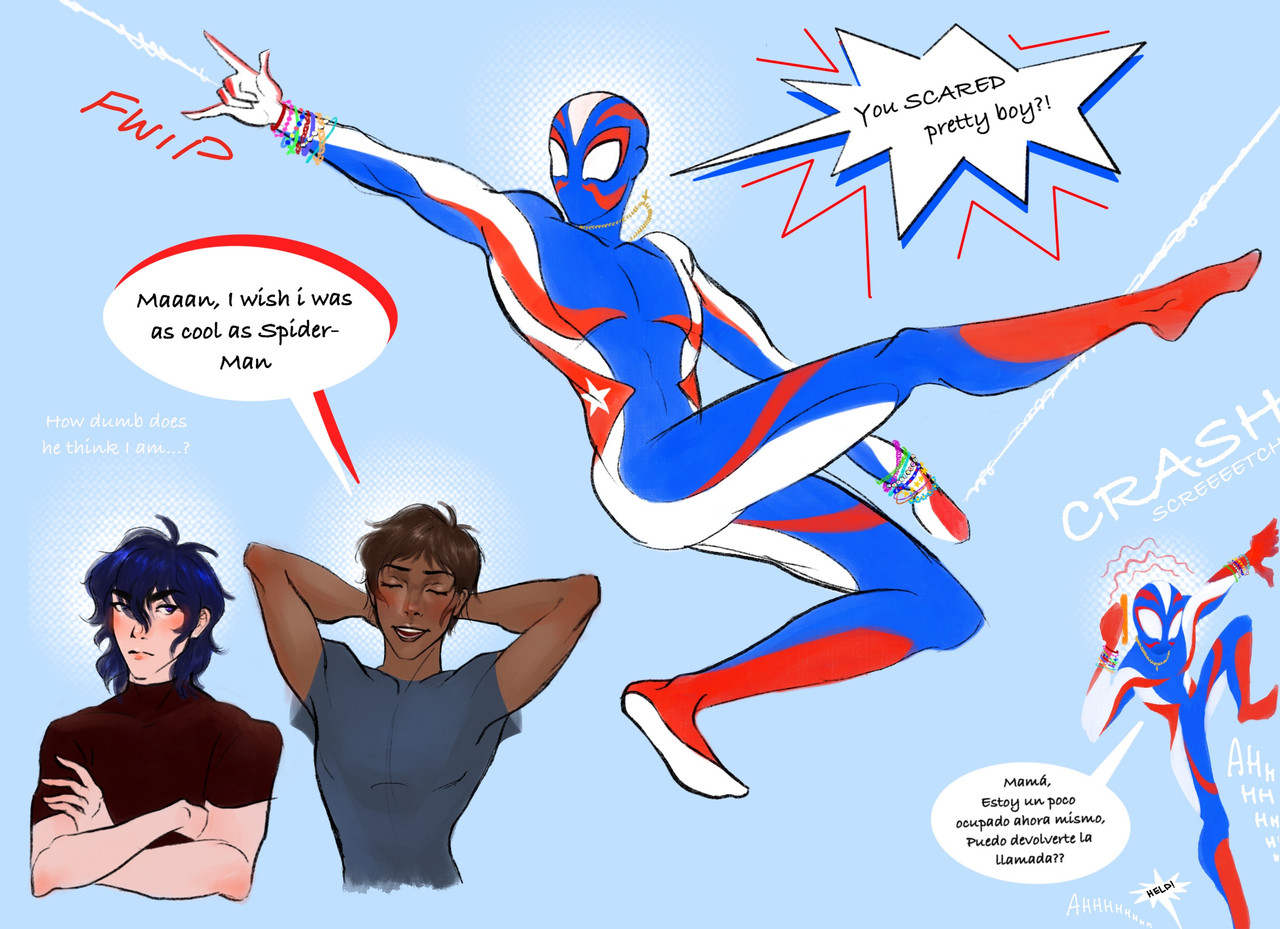 And then he just… left him there. Flung himself into the air with two webs shooting out to grasp a sky scraper on his right, leaving Keith to have a front row seat to the Spider-Man show. The playful taunting. The quips. Rapid fire Spanish cursing when the enemy did something displeasing.
