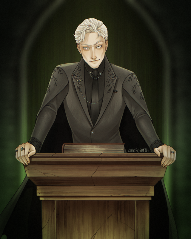 He reached the podium, dropping the tome down with a mighty thud. He faced the class with a cool and assertive confidence. His robes seemed exquisitely expensive and were absolutely custom fit. His hair was neat, being swept stylishly to the side. Three rings adorned his fingers, and they glittered when the candlelight hit them just right. The substitute looked as important and professional as Scorpius knew him to be.