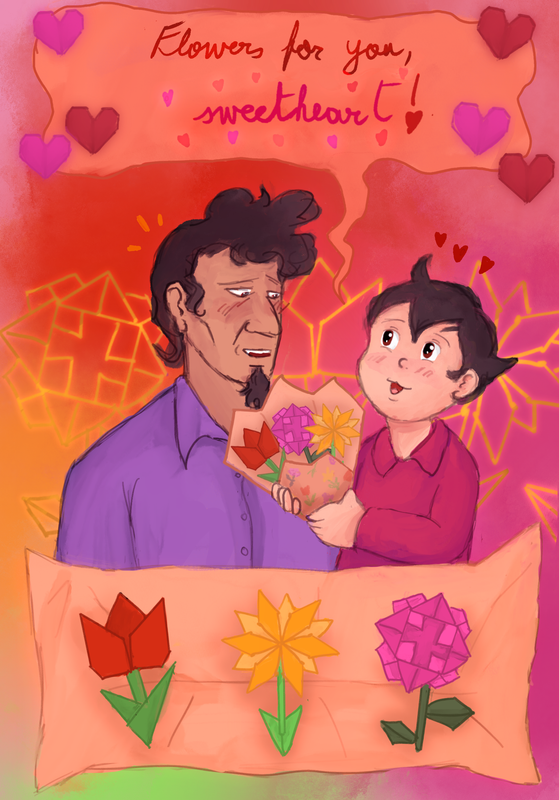 “Lots of flowers and kisses for you, sweetheart!” Atom quickly turned his words into soft wet kisses against his father’s cheeks.